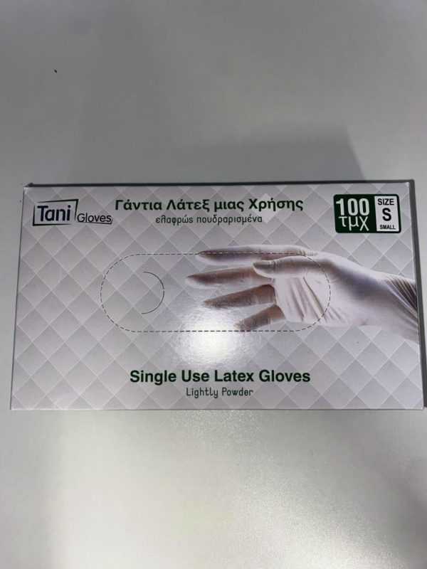 Γάντια λάτεξ μιας χρήσης χωρίς πούδρα της εταιρείας Eurolamp σε λευκό χρώμα.